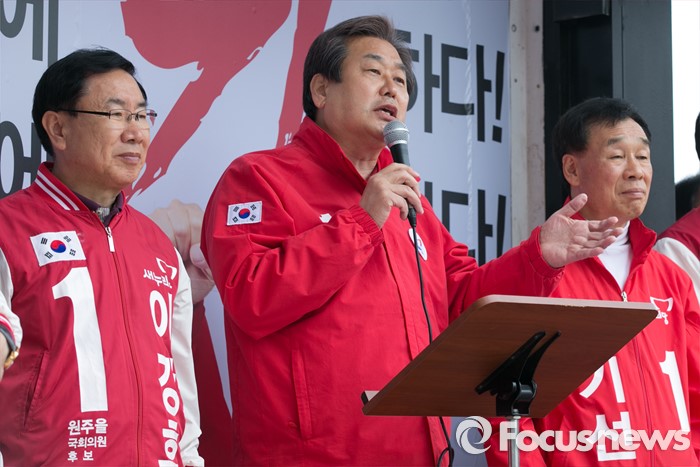 (원주=포커스뉴스) 제20대 국회의원 선거를 나흘 앞둔 9일 오전 강원도 원주시 치악로 남부시장 앞에서 김무성(가운데) 새누리당 대표가 김기선(오른쪽) 원주갑, 이강후 원주을 후보 지원유세를 하고 있다.