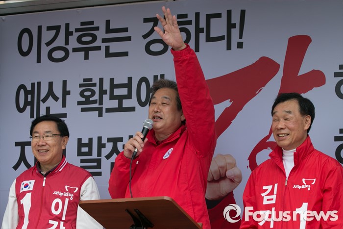 (원주=포커스뉴스) 제20대 국회의원 선거를 나흘 앞둔 9일 오전 강원도 원주시 치악로 남부시장 앞에서 김무성(가운데) 새누리당 대표가 김기선(오른쪽) 원주갑, 이강후 원주을 후보 지원유세를 하고 있다.