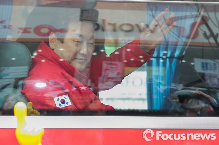 (원주=포커스뉴스) 제20대 국회의원 선거를 나흘 앞둔 9일 오전 강원도 원주시 치악로 남부시장 앞에서 김무성 새누리당 대표가 김기선 원주갑, 이강후 원주을 후보 지원유세 마친 뒤, 차에 올라 손을 흔들고 있다.