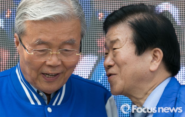 (대전=포커스뉴스) 9일 오후 대전 서구 도마네거리에서 김종인(왼쪽) 더불어민주당 비대위 대표 겸 선대위원장과 박병석 대전서구갑 후보가 선거유세 중 대화하고 있다.