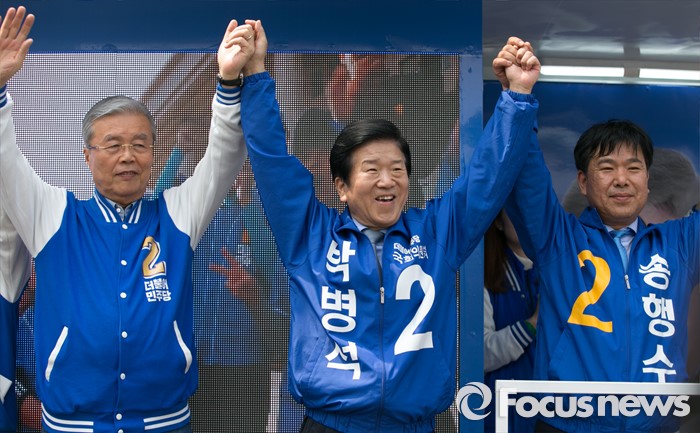 (대전=포커스뉴스) 9일 오후 대전 서구 도마네거리에서 김종인(왼쪽부터) 더불어민주당 비대위 대표 겸 선대위원장과 박병석 대전서구갑 후보, 송행수 중구 후보가 선거유세를 하며 지지를 호소하고 있다.