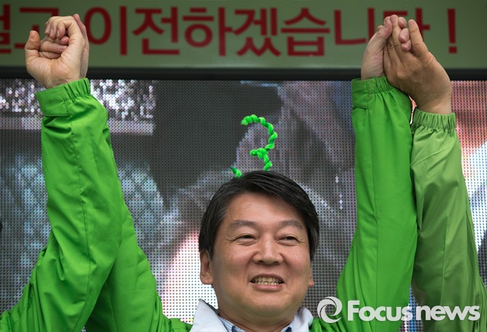 (수원=포커스뉴스) 9일 오후 수원시 장안구 수원종합운동장에서 열린 국민의당 합동유세에 참석한 안철수 대표가 후보자들과 함꼐 손을 잡고 총선 승리를 위해 결의를 다지고 있다.