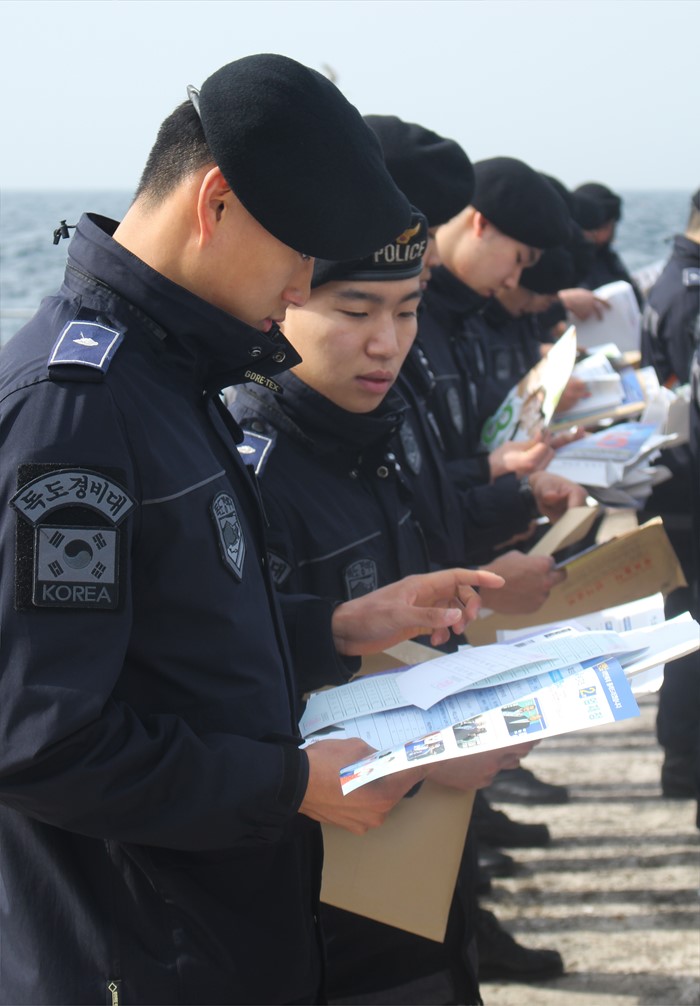 (서울=포커스뉴스) 9일 오전 경북 울릉군 독도에서 독도경비대원들이 제20대 국회의원 선거 거소투표를 하기 전 후보 안내문을 보고 있다. <사진제공=경북지방경찰청>