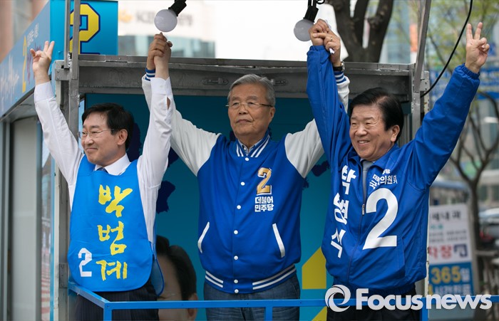 (대전=포커스뉴스) 9일 오후 대전 갤러리아백화점 타임월드점 앞에서 열린 더불어민주당 대전 서구 합동유세에 참석한 김종인(가운데) 비대위 대표 겸 선대위원장, 박범계(왼쪽) 서구을, 박병석 서구갑 후보가 손을 들어 지지를 호소하고 있다.