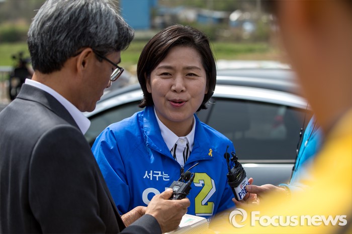 (광주=포커스뉴스) 양향자 더불어민주당 광주광역시 서구을 후보가 9일 오전 광주광역시 서구 발산마을회관에서 취재진과 인터뷰 하고 있다.