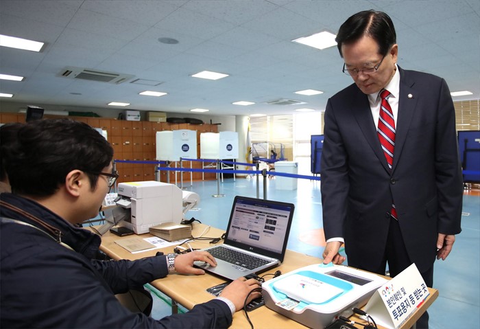 (서울=포커스뉴스) 정의화 국회의장이 9일 오전 서울 용산구 한남동주민센터에 마련된 20대 총선 사전투표소에서 투표에 앞서 본인확인을 하고 있다. <사진제공=국회>