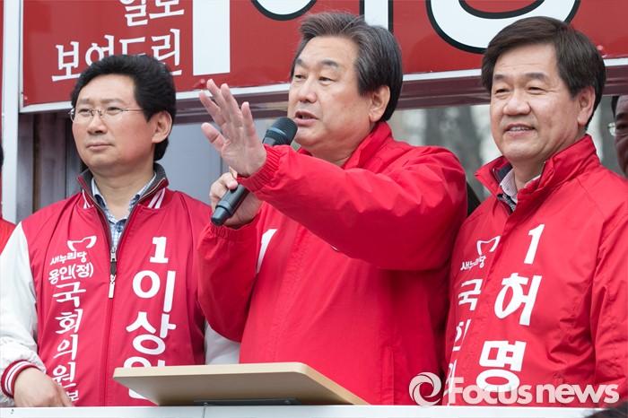 (용인=포커스뉴스) 제20대 국회의원 선거를 나흘 앞둔 9일 오후 경기도 용인시 기흥구 죽현마을 중앙공원에서 김무성(가운데) 새누리당 대표가 이상일(왼쪽) 용인정, 허명환(오른쪽) 용인을 후보 지원유세를 하고 있다.