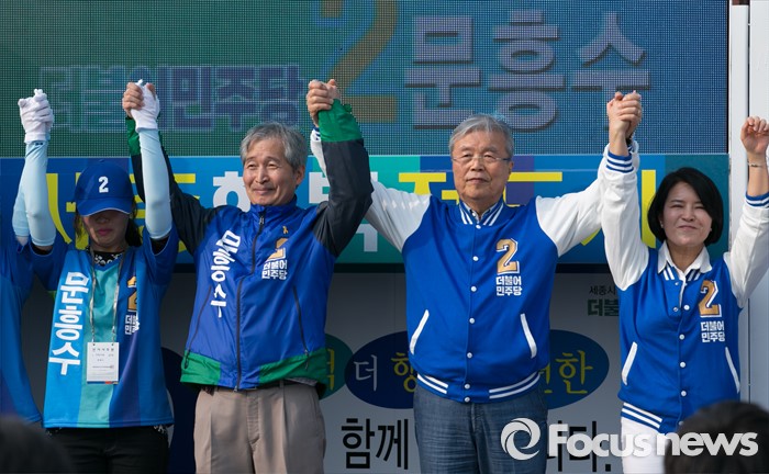 (세종=포커스뉴스) 9일 오후 세종시 국립세종도서관 앞에서 김종인(오른쪽 두번쨰) 더불어민주당 비대위 대표 겸 선대위원장과 문흥수(왼쪽 두번째) 세종시 후보, 허윤정(오른쪽 첫번째) 비례대표 후보가 손을 들어 인사하며 지지를 호소하고 있다.