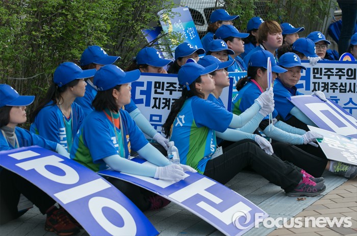 (세종=포커스뉴스) 9일 오후 세종시 국립세종도서관 앞에서 문흥수 더불어민주당 세종시 후보의 선거운동원들이 김종인 비대위 대표 겸 선대위원장을 기다리며 그늘에서 휴식을 보내고 있다.
