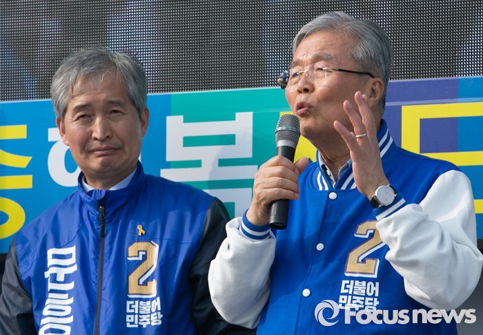 이날 김 대표는 "단도직입적으로 얘기하겠다. '부익부 빈익빈'하는 정당을 택하겠냐, 경제정당·수권정당·서민의 정당으로 우리의 경제정책 방향을 바꿀 정당을 택하겠냐"면서 유권자들을 향해 "'표'라는 유일한 권력으로 심판해 달라"고 요청했다.(세종=포커스뉴스) 9일 오후 세종시 국립세종도서관 앞에서 김종인(오른쪽) 더불어민주당 비대위 대표 겸 선대위원장이 문흥수 세종시 후보의 지지를 호소하고 있다. 2016.04.09 박동욱 기자