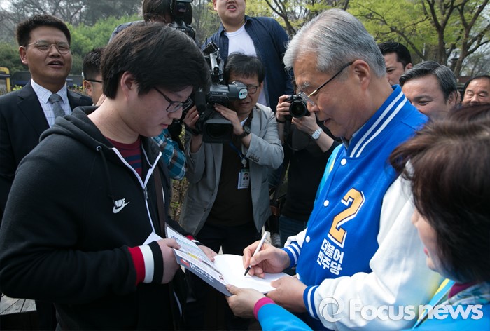 (서울=포커스뉴스) 김종인 더불어민주당 비대위 대표 겸 선대위원장과 전혜숙 광진갑 후보가 10일 오전 서울 어린이대공원 앞에서 한 시민에게 사인을 해주고 있다.
