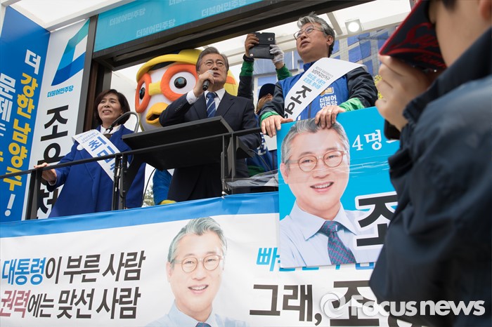 (남양주=포커스뉴스) 문재인 더불어민주당 전 대표가 10일 오전 경기도 이마트 남양주점 인근에서 조응천 더불어민주당 남양주갑 후보, 최민희 더불어민주당 남양주병 후보와 함께 유권자들에게 지지를 호소하고 있다.