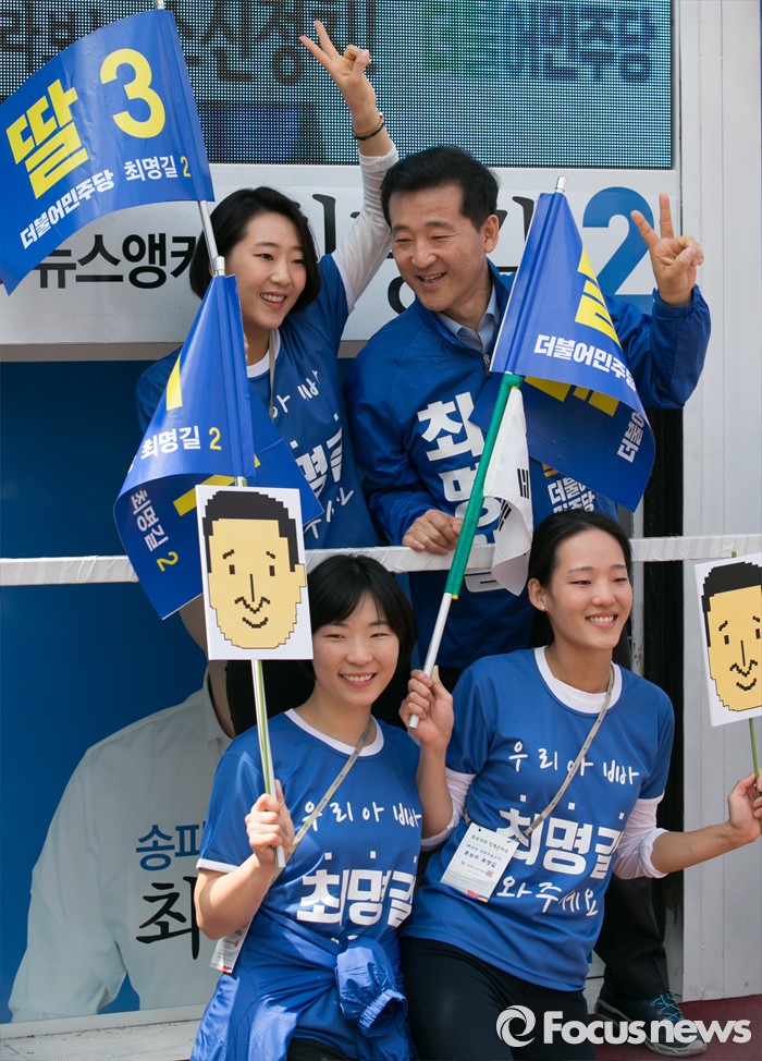(서울=포커스뉴스) 최명길(뒷줄 오른쪽) 더불어민주당 송파을 후보가 10일 오전 서울 석촌호수 서호 인근 거리에서 선거유세 중 딸들과 함께 포즈를 취하고 있다.