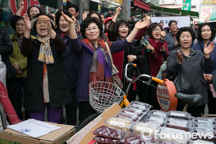 (서울=포커스뉴스) 10일 오전 서울 강동구 양재대로 둔촌시장 앞에서 시민들이 이재영 새누리당 강동을 후보 지원유세를 보며 박수치고 있다.