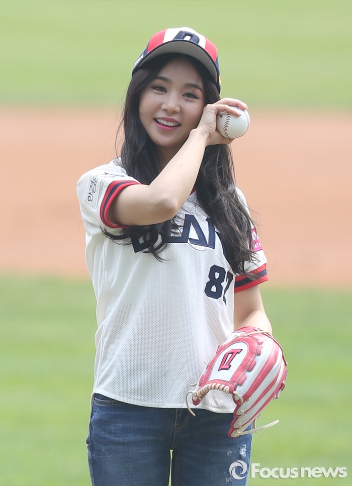 (서울=포커스뉴스) 10일 서울 잠실구장에서 열린 2016 프로야구 넥센-두산 경기에서 시구자로 나온 걸그룹 피에스타의 차오루가 마운드에서 머리를 ㅈㅇ리하고 있다.