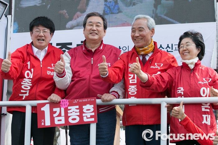 (서울=포커스뉴스) 김무성(왼쪽 두번째) 새누리당 대표가 10일 오후 서울 강남구 수서역 앞에서 이종구(왼쪽) 강남갑, 김종훈(오른쪽 두번째) 강남을, 이은재(오른쪽) 강남병 합동 지원유세를 하고 있다.