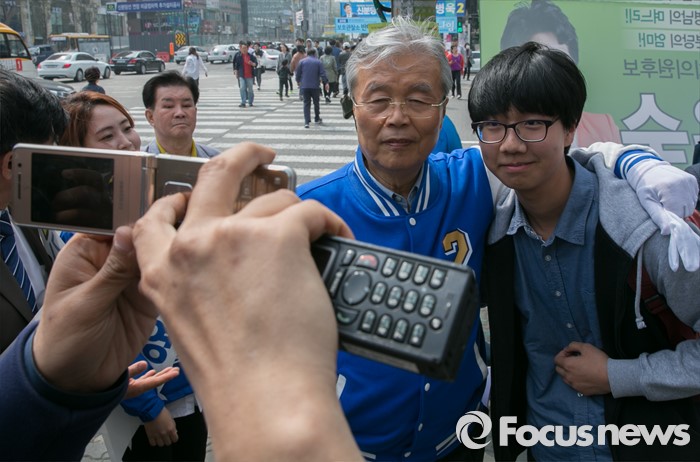 (성남=포커스뉴스) 10일 오후 경기도 성남 미금역 앞에서 더불어민주당 분당 합동유세를 마친 김종인 비대위 대표 겸 선대위원장이 한 시민과 기념촬영을 하고 있다.