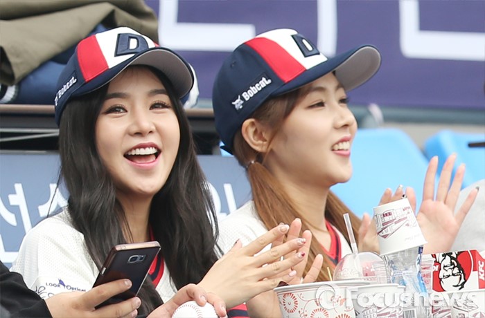 (서울=포커스뉴스) 10일 서울 잠실구장에서 열린 2016 프로야구 넥센-두산 경기에서 시구한 걸그룹 피에스타의 차오루(왼쪽)와 혜미가 응원단의 음악에 맞춰 박수를 치며 경기를 관전하고 있다.