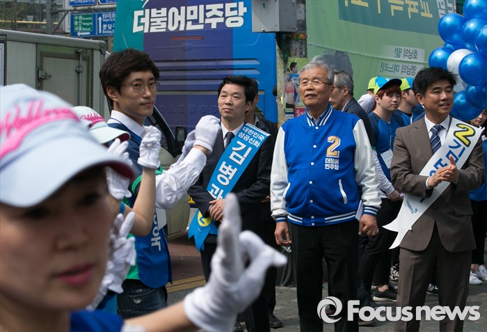 (성남=포커스뉴스) 10일 오후 경기도 성남 미금역 앞에서 열린 더불어민주당 분당 합동유세에 참석한 김종인(가운데) 비대위 대표 겸 선대위원장과 김병관(왼쪽) 분당갑, 김병욱 분당을 후보가 선거운동원들의 율동을 바라보고 있다.