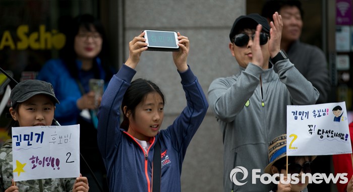 (용인=포커스뉴스) 10일 오후 경기도 기흥구청 인근 거리에서 어린이들이 김민기 더불어민주당 용인을 후보의 지지를 호소하고 있다.