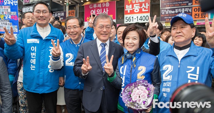 (서울=포커스뉴스) 10일 오후 서울 CGV 강남점 앞에서 김기영(왼쪽부터) 더불어민주당 서초을 후보, 김성곤 강남갑 후보, 문재인 전 대표, 이정근 서초갑 후보와 함께 유권자들에게 지지를 호소하고 있다.