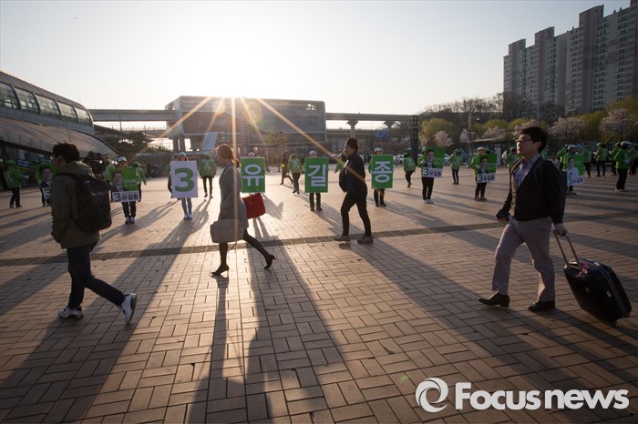 (인천=포커스뉴스) 국민의당 인천 서구갑 유길종 후보와 서구을 허영 캠프의 선거운동원들이 11일 아침 인천시 서구 검암역에서 국민의당 합동 출근인사를 하고 있다.