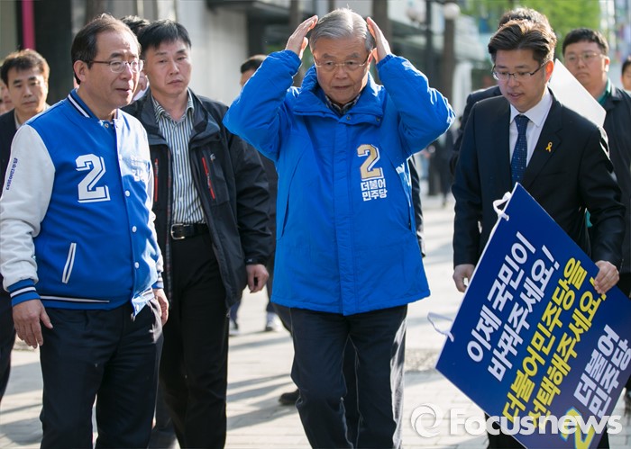 (서울=포커스뉴스) 20대 총선을 이틀 앞둔 11일 오전 서울 지하철 선릉역 인근 거리에서 투표참여 캠페인을 마친 김종인(가운데) 더불어민주당 비대위 대표 겸 선대위원장이 김성곤(왼쪽) 강남갑 후보의 지원유세를 위해 이동하고 있다.