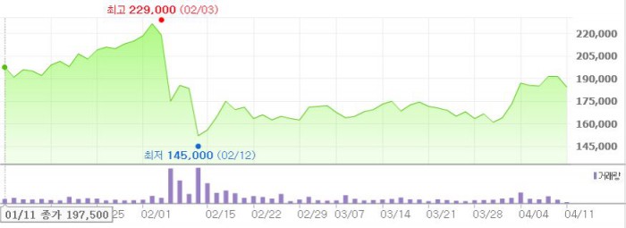 그는 "구조적 성장은 계속되나, 골프장 인수 등으로 상반기에 실적 변수가 많을 것"이라며 "현재 주가는 중장기 성장성에 대한 프리미엄이 상당부분 반영됐다"고 평가했다 .최근 3개월간 BGF리테일 주가 추이 <그래픽출처=네이버>