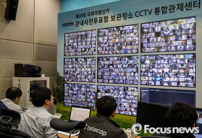 (과천=포커스뉴스) 4.13 총선을 이틀 앞둔 11일 오전 경기 과천 중앙선거관리위원회 내 관내사전투표함 보관장소 CCTV통합관제센터에서 선관위 관계자들이 실시간으로 투표함을 감시하고 있다.