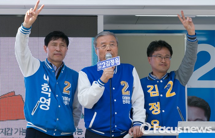 (군포=포커스뉴스) 20대 총선을 이틀 앞둔 11일 오후 경기도 군포 당동우체국 사거리에서 열린 더불어민주당 군포지역 합동유세에 참석한 김종인(가운데) 비대위 대표 겸 선대위원장이 김정우(오른쪽) 군포갑, 이학영 군포을 후보의 지지를 호소하고 있다.