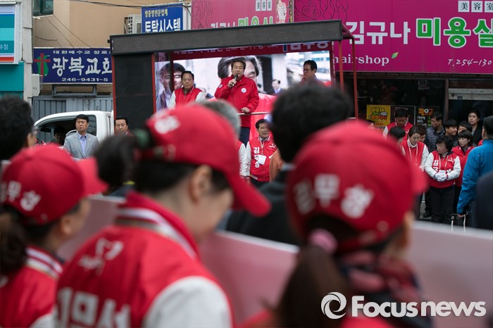 (부산=포커스뉴스) 제20대 총선에서 부산 중구영도에 출마한 김무성 새누리당 대표가 11일 오후 부산 중구 보수동 책방골목 앞에서 유세를 하고 있다.