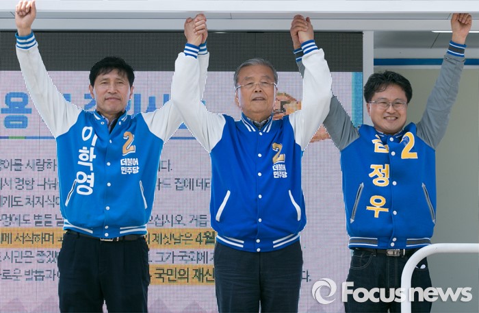 (군포=포커스뉴스) 20대 총선을 이틀 앞둔 11일 오후 경기도 군포 당동우체국 사거리에서 열린 더불어민주당 군포지역 합동유세에 참석한 김종인(가운데) 비대위 대표 겸 선대위원장이 김정우(오른쪽) 군포갑, 이학영 군포을 후보의 지지를 호소하고 있다.