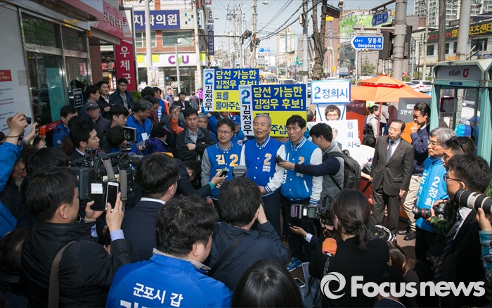 (군포=포커스뉴스) 20대 총선을 이틀 앞둔 11일 오후 경기도 군포 당동우체국 사거리에서 열린 더불어민주당 군포지역 합동유세에 참석한 김종인(가운데) 비대위 대표 겸 선대위원장이 김정우(왼쪽) 군포갑, 이학영 군포을 후보와 함께 취재진 질문에 답하고 있다.
