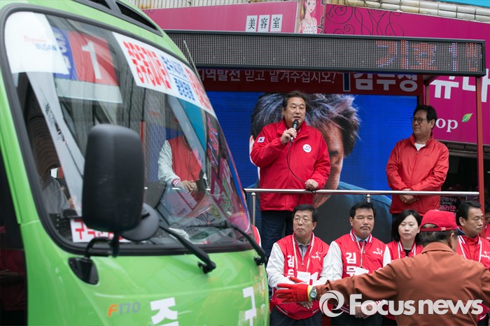 (부산=포커스뉴스) 제20대 총선에서 부산 중구영도에 출마한 김무성 새누리당 대표가 11일 오후 부산 중구 보수동 책방골목 앞에서 유세를 하고 있다.