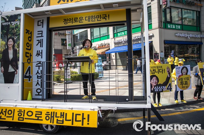 (고양=포커스뉴스) 11일 오후 경기도 고양시 덕양구 세이브존 쇼핑몰 앞에서 심상정 정의당 후보가 시민들을 향해 한 표를 호소하고 있다.