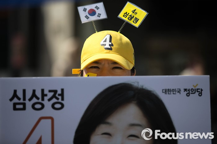 (고양=포커스뉴스) 11일 오후 경기도 고양시 덕양구 세이브존 쇼핑몰 앞에서 열린 심상정 정의당 후보의 유세에서 한 자원봉사자가 손피켓을 들고 있다.