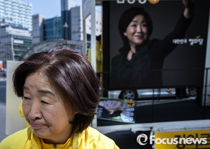 (고양=포커스뉴스) 11일 오후 경기도 고양시 덕양구 세이브존 쇼핑몰 앞에서 심상정 정의당 후보가 시민들을 향해 한 표를 호소하고 있다.
