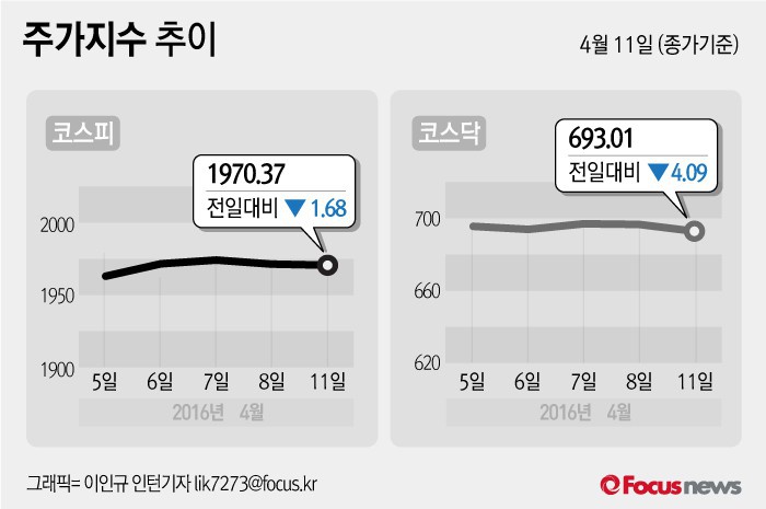 (서울=포커스뉴스) 11일 코스피지수는 전날 보다 0.09%(1.68포인트) 내린 1970.37에 장을 마쳤다. 코스닥지수는 전일 대비 0.59%(4.09포인트) 내린 693.01에 마감했다.