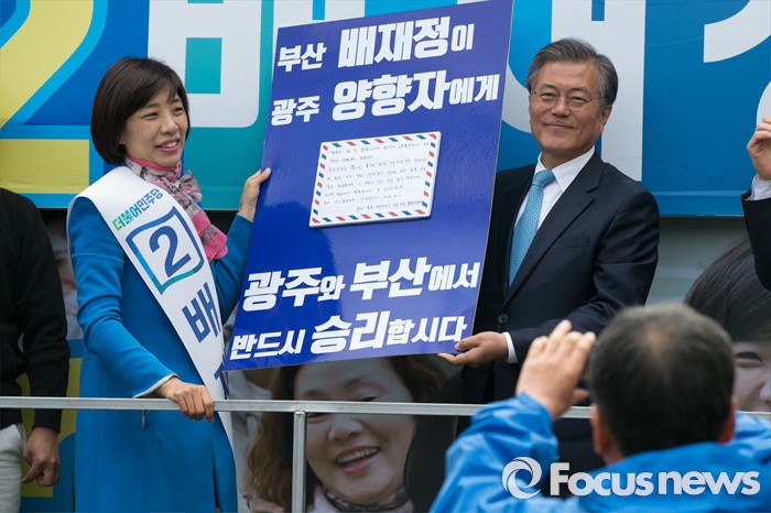 (부산=포커스뉴스) 문재인(오른쪽) 전 더불어민주당 대표가 11일 오후 부산시 사상구 가야대로 주례럭키아파트 앞에서 배재정 더불어민주당 사상 후보 지원유세 중, 배 후보가 양향자 광주시 서구을 후보에게 보내는 편지를 들고 있다.