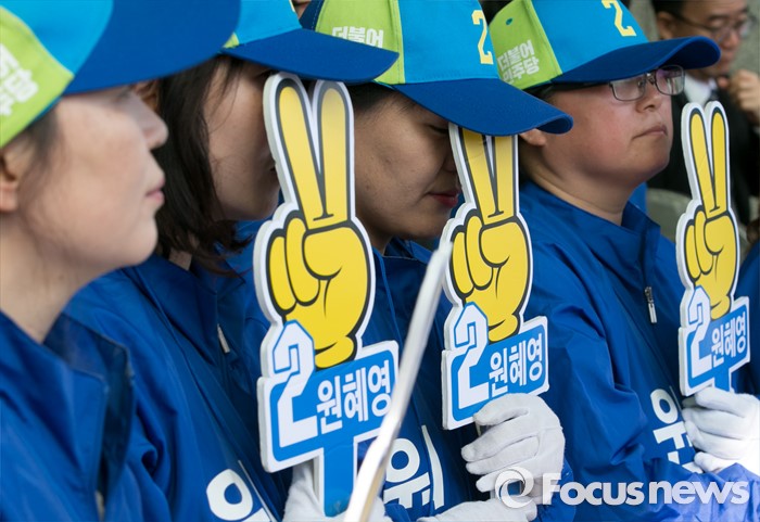(부천=포커스뉴스) 20대 총선을 이틀 앞둔 11일 오후 경기도 부천역 남부광장에서 열린 더불어민주당 부천지역 합동유세에 참여한 선거운동원들이 지지를 호소하고 있다.