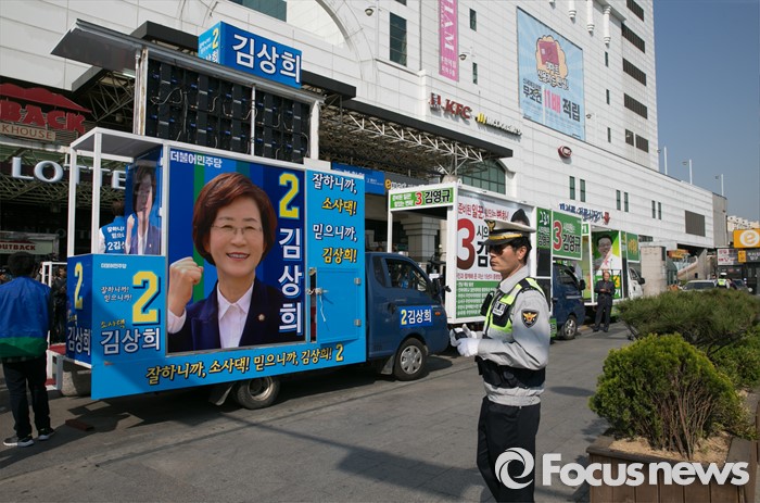 (부천=포커스뉴스) 20대 총선을 이틀 앞둔 11일 오후 경기도 부천역 남부광장에서 더불어민주당과 국민의당의 유세차량이 대기하고 있다.