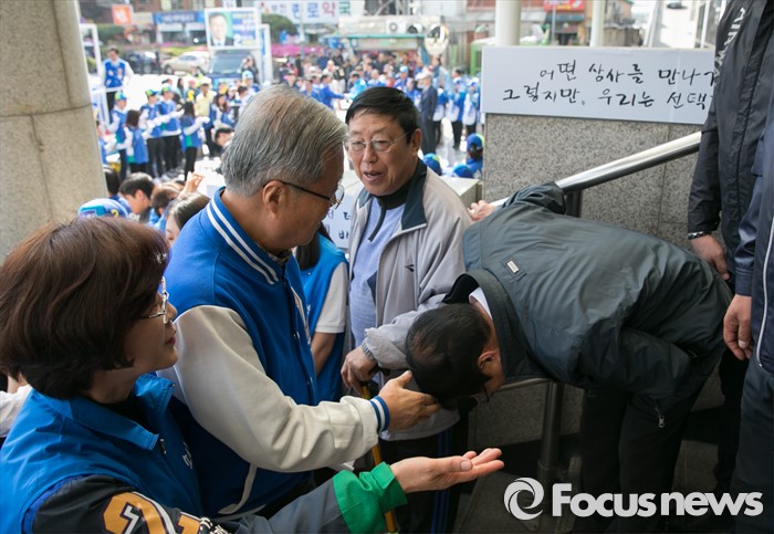 (부천=포커스뉴스) 20대 총선을 이틀 앞둔 11일 오후 경기도 부천역 남부광장에서 열린 더불어민주당 부천지역 합동유세에 참석한 김종인 비대위 대표 겸 선대위원장이 시민 및 지지자들과 인사하고 있다.