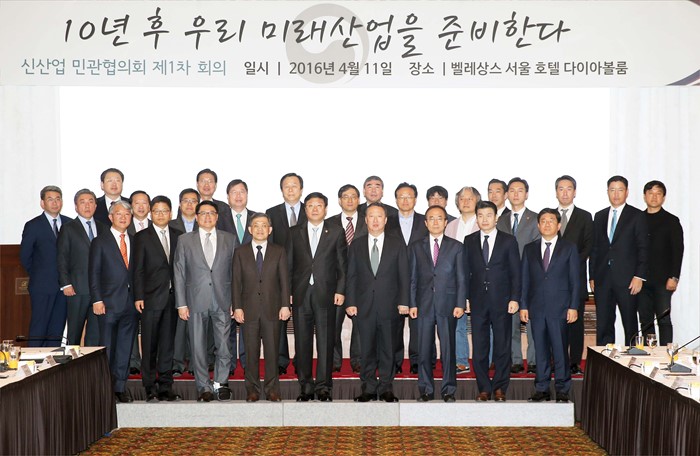 (서울=포커스뉴스) 주형환 산업통상자원부 장관이 11일 오전 서울 강남구 역삼동 벨레상스 서울호텔 다이아몬드볼룸에서 열린 신산업 민관협의회 제1차 회의에 참석해 기념촬영을 하고 있다.