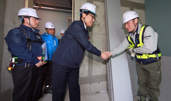 (세종=포커스뉴스) 고영선 고용노동부 차관이 11일 오후 세종시 아파트건설현장을 방문, 건설 근로자들의 안전관리실태를 점검, 건설현장 관계자을 격려하고 있다. <사진제공=고용노동부>