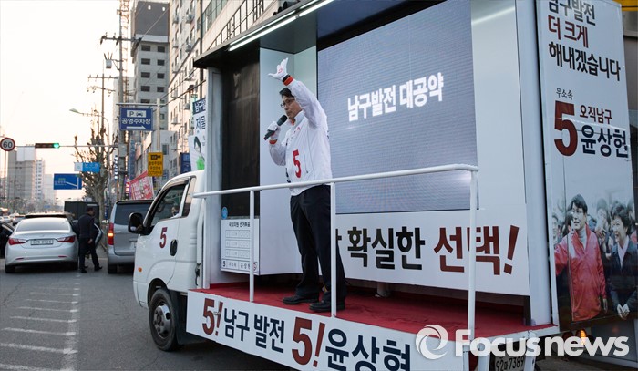 (인천=포커스뉴스) 20대 총선을 이틀 앞둔 11일 오후 인천 남구 제물포역 앞에서 윤상현 무소속 남구을 후보가 유권자에게 지지호소 하고 있다.