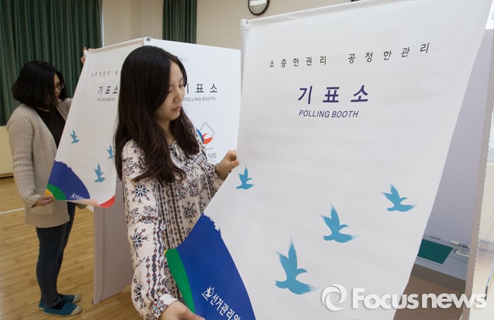 (세종=포커스뉴스) 20대 국회의원 선거를 하루 앞둔 12일 오전 세종시 조치원읍 세종시민체육관에 마련된 투표소에서 관계자들이 투표소 준비를 하고 있다.