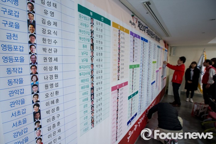 (서울=포커스뉴스) 제20대 국회의원선거를 하루 앞둔 12일 오전 서울 영등포구 새누리당사에서 관계자들이 선거상황실을 설치 하고 있다.