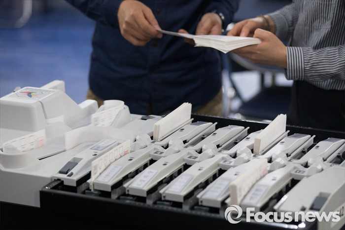 (서울=포커스뉴스) 4.13총선을 하루 앞둔 12일 오후 서울 영등포구 여의도고등학교 체육관에 마련된 개표소에서 선관위 관계자들이 투표지분류기를 점검하고 있다.