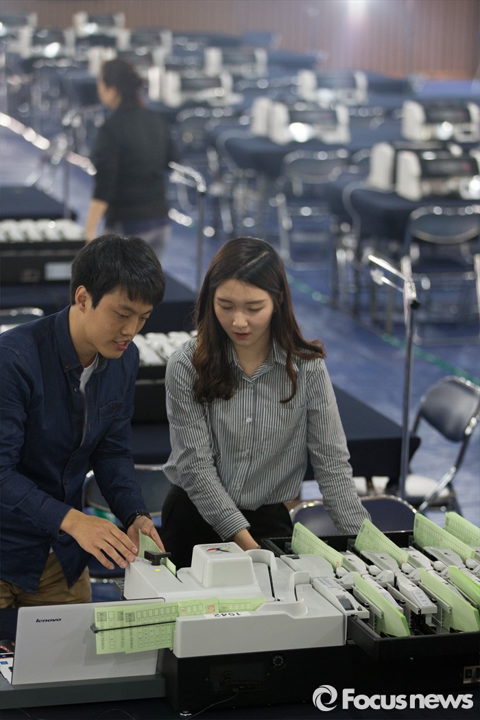 (서울=포커스뉴스) 4.13총선을 하루 앞둔 12일 오후 서울 영등포구 여의도고등학교 체육관에 마련된 개표소에서 선관위 관계자들이 투표지분류기를 점검하고 있다.