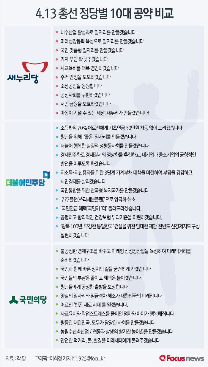 (서울=포커스뉴스) 국회의원 선거를 하루 앞두고 생활로 바빠 확인하지 못했던 공약을 들여다보게 되는 시간이다. 하루정도 전엔 선거 당일에 뽑을 후보자를 어느정도 결정해야 하는데 각당의 공약이 마치 짜기라고 한 듯이 비슷한 상황이다.